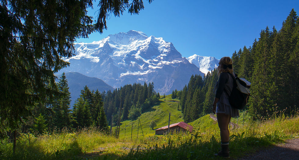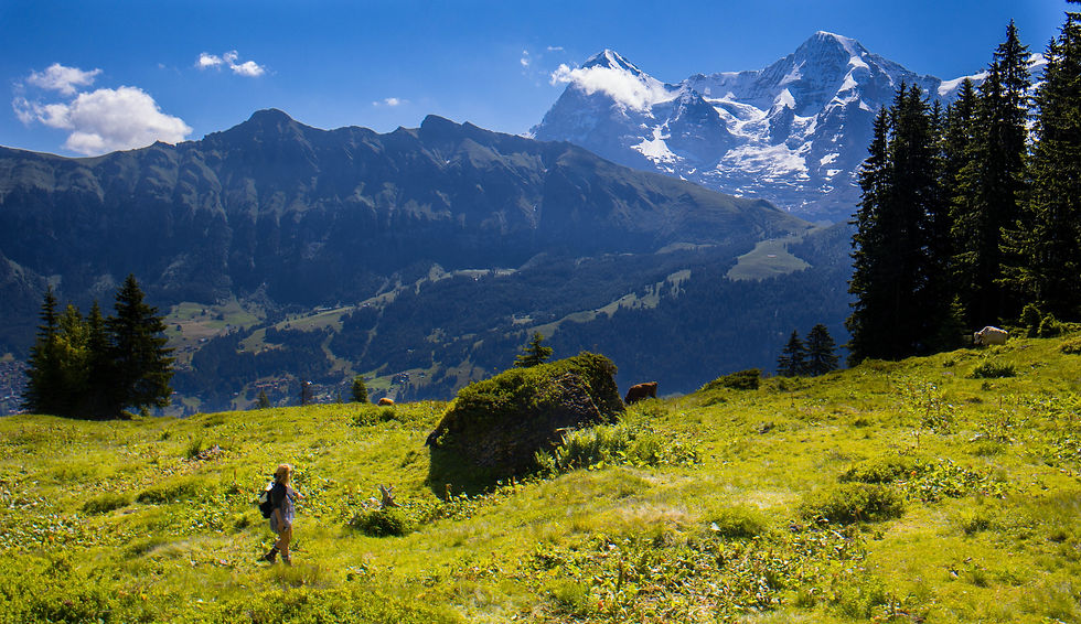 We began our journey on the paved/gravel trail but about five minutes in saw a sign for a more strenuous route called the Mountain View Trail... TAKE IT! The views were insane and littered with Swiss cows moo-ing in all of their glory. I literally felt like I was in the sound of music, minus the annoyance of children following me around singing of course! We reached the highest view point and took some photos then decided to break off the trail and hike down through the side of a cow pasture to the most beautiful meadow EVER. We had run out of water at the point but lucky for us there was a glacier waterfall flowing down into a stream that we could refill at. Yes, that's right the water is pure enough to drink right from the stream (as far as we know).